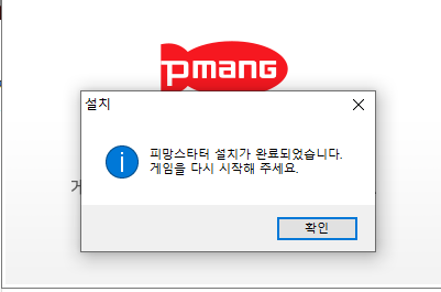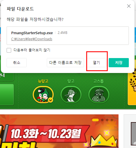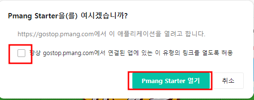 아래의 체크박스를 체크하면 실행할 때 마다 아래의 박스가 뜨지 않고 바로 실행할 수 있으니 체크를 하고 Pmang Starter 열기 버튼을 클릭합니다.