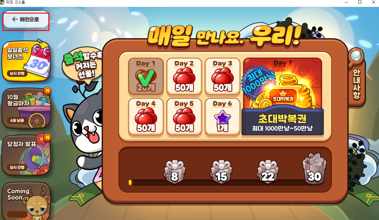 아래 화면과 같이 피망뉴맞고가 실행되면 메인으로 버튼을 클릭합니다.