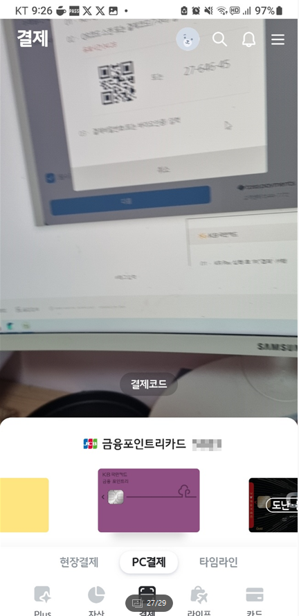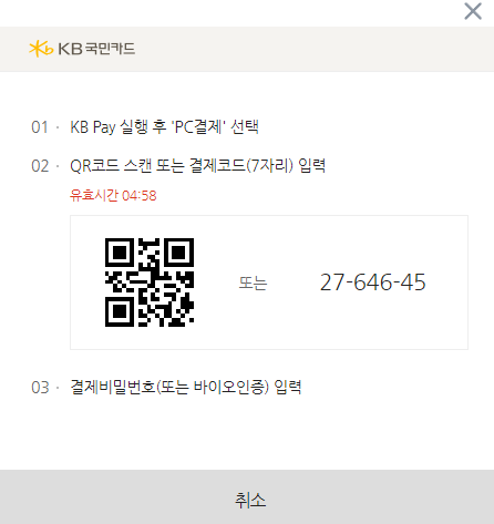아래처럼 PC화면에서 QR코드가 보입니다. 이제 KB PAY를 실행하여 결제를 해보겠습니다.