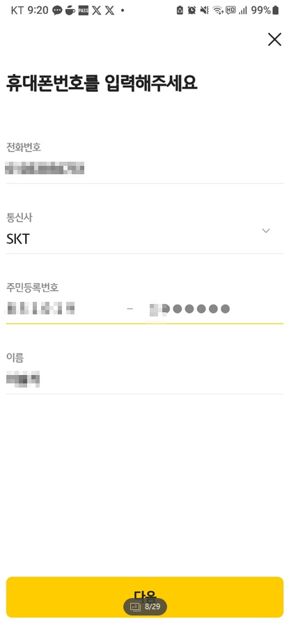 이름, 휴대폰번호, 주민등록번호를 입력하고 다음을 누르면 휴대폰 문자메시지 인증번호가 옵니다.