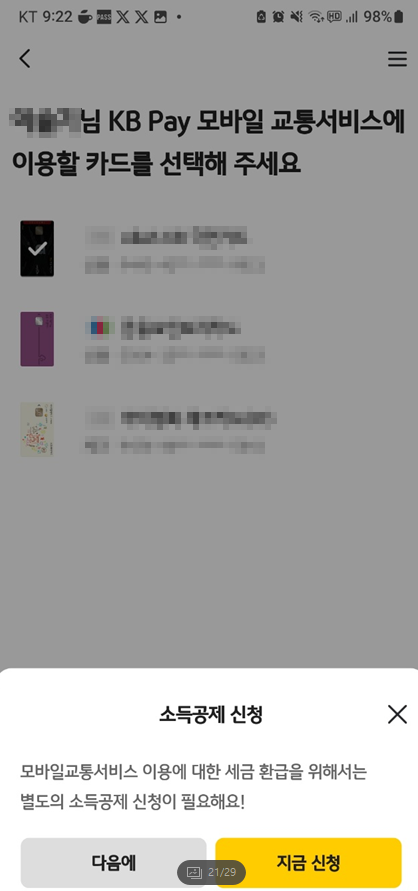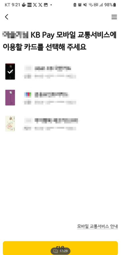 아래처럼 교통서비스 등록을 클릭 -> 약관동의 후 나의 카드 중 교통카드로 원하는 카드를 체크 후 신청하면 KB PAY로 대중교통을 이용할 때 자동으로 해당 카드에서 교통비가 차감됩니다.
