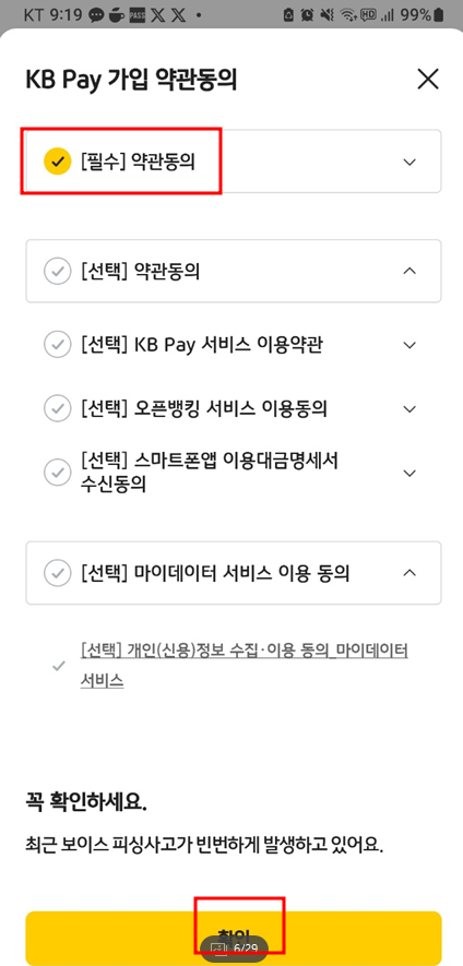 필수와 선택이 있으니 필수만 체크하고 확인 버튼을 클릭합니다.