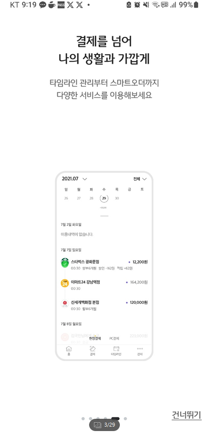 KB PAY 사용방법입니다. 최초 어플을 실행하면 아래와 같은 설명이 나옵니다. 읽어보고 건너띄기를 클릭하고 시작 버튼을 클릭합니다.