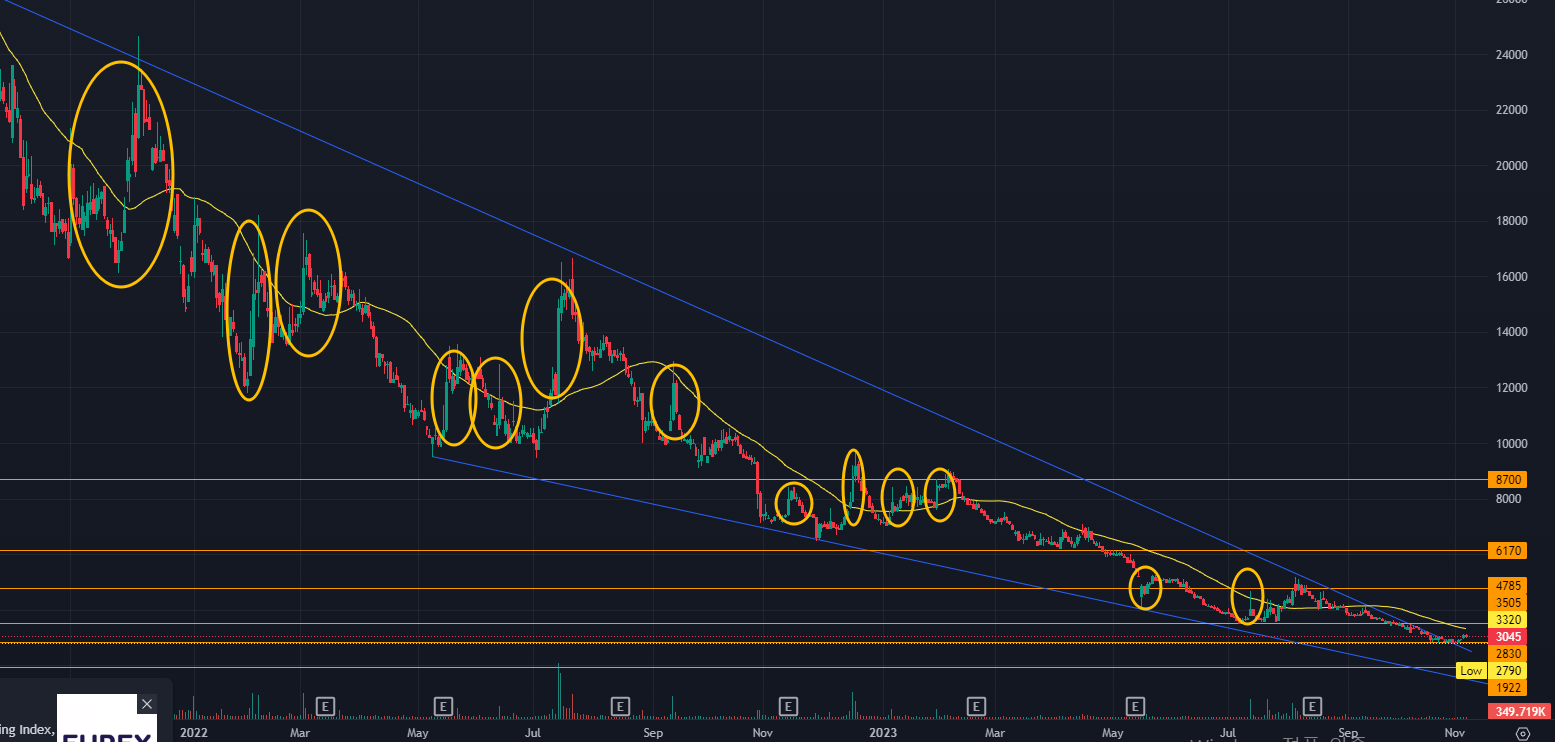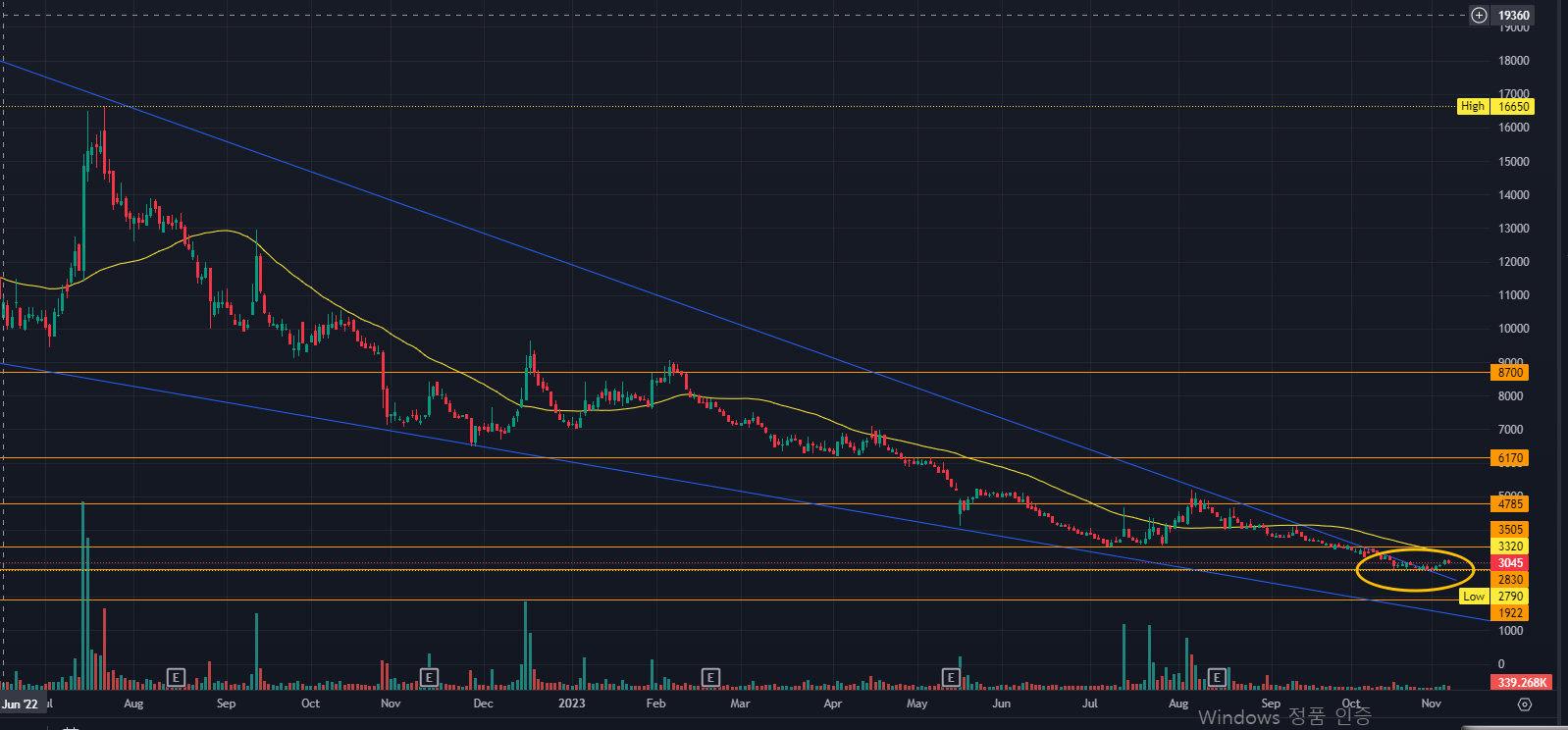 큰 하락 후 최근 2790원 자리를 찍고 그 후 횡보하면서 바닥을 만들어주고 있는 모습입니다.