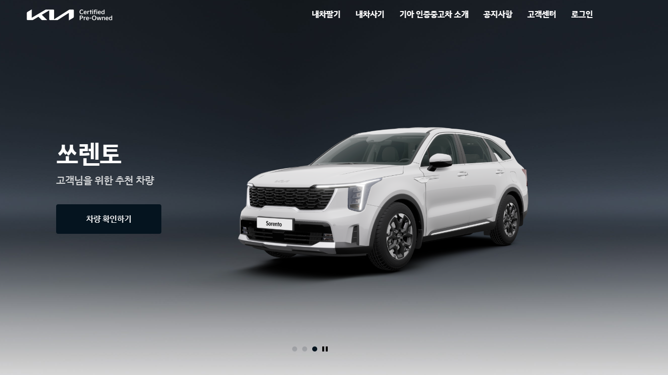 최초 접속하면 아래의 화면과 같이 기아차 홈페이지와 비슷한 중고차 사이트를 확인할 수 있습니다.