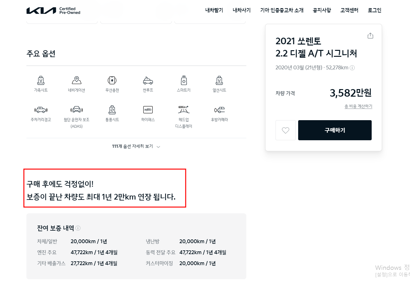 그리고 아래의 네모 박스와 같이 구매 후 보증이 끝난 차량도 최대 1년 2만km 기아에서 보증한다고 적혀 있습니다.
