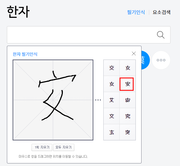 모든 획을 다 그리지 않아도 우측에 내가 그린 한자와 비슷한 한자를 보여줍니다.