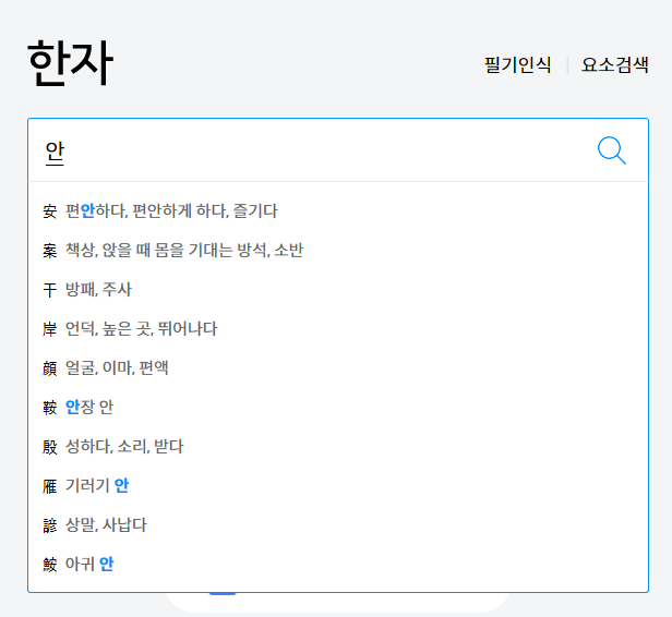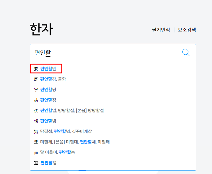 예로 아래와 같이 편안할 안의 한자를 찾기 위해 편안을 검색하면 아래와 같이 한자 리스트를 보여줍니다.