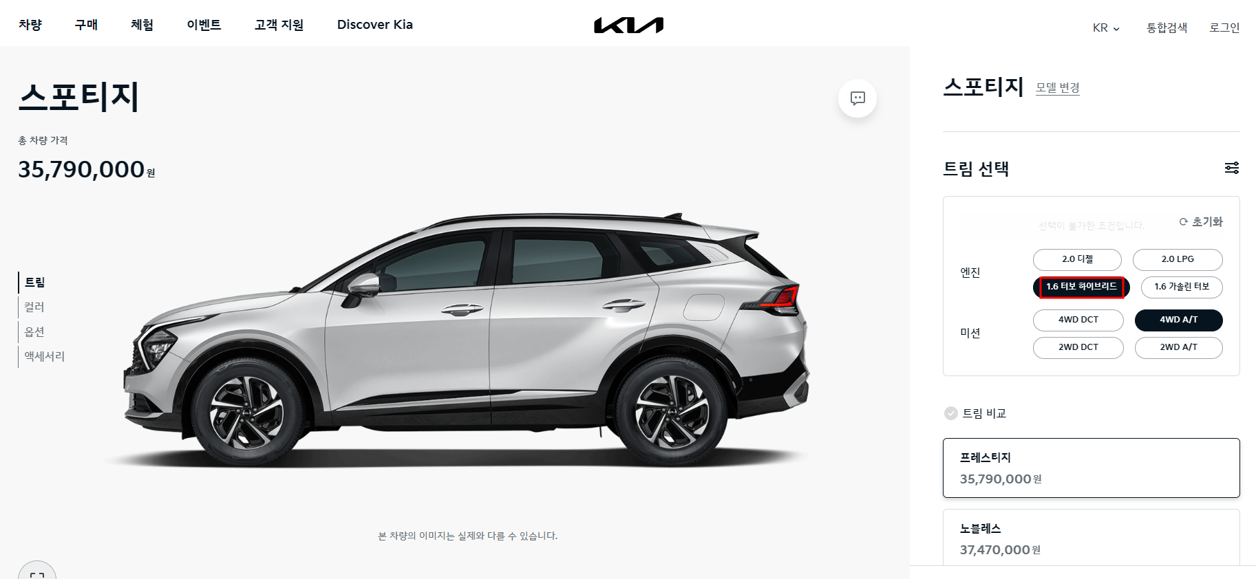 이제 기아차의 하이브리드 차량을 확인해도록 하겠습니다.