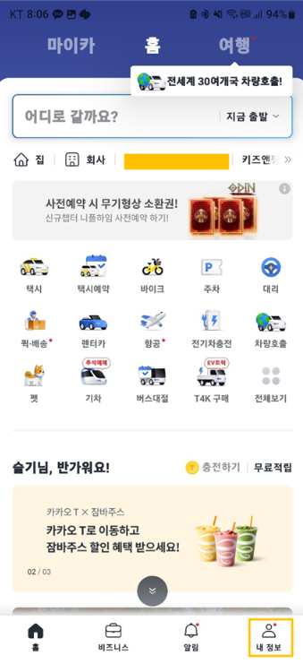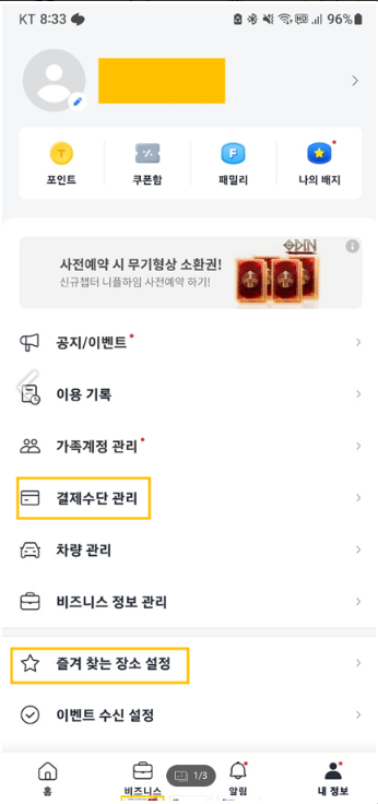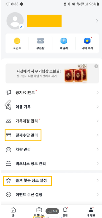 메인화면의 우측 하단에 보이는 "내정보"를 클릭하여 결제수단을 미리 설정합니다.