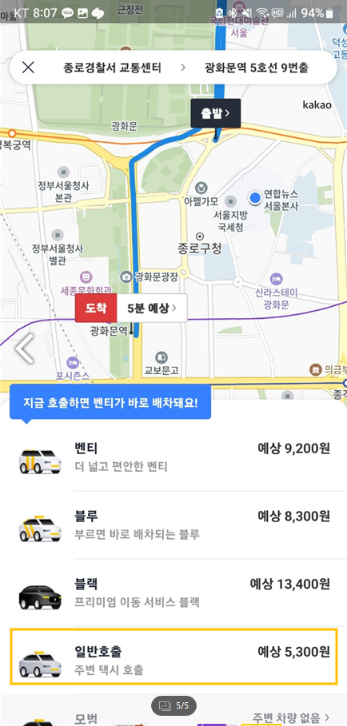 호출하기를 클릭하면 현재 위치 근처에 카카오택시를 사용하는 기사들에게 알람이 울립니다. 원하는 기사분 께서 호출을 클릭하면 나와 매칭되어 내가 설정한 출발지로 오시게 됩니다. 오는 경로와 차량 정보 그리고 도착시간까지 모두 표기되기 때문에 편리합니다.
