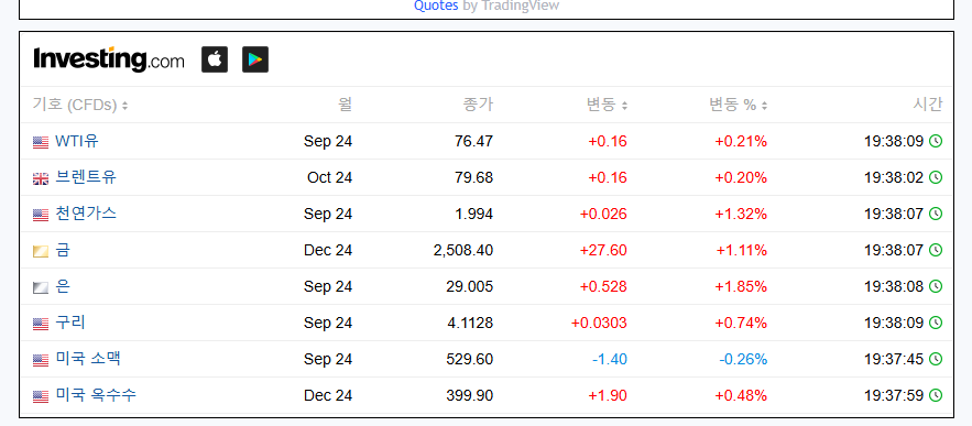 화면 아래를 내려보면 유가 뿐 아니라 금 / 은 / 구리 / 소맥 / 옥수수 등의 원자재 가격을 볼 수 있습니다.