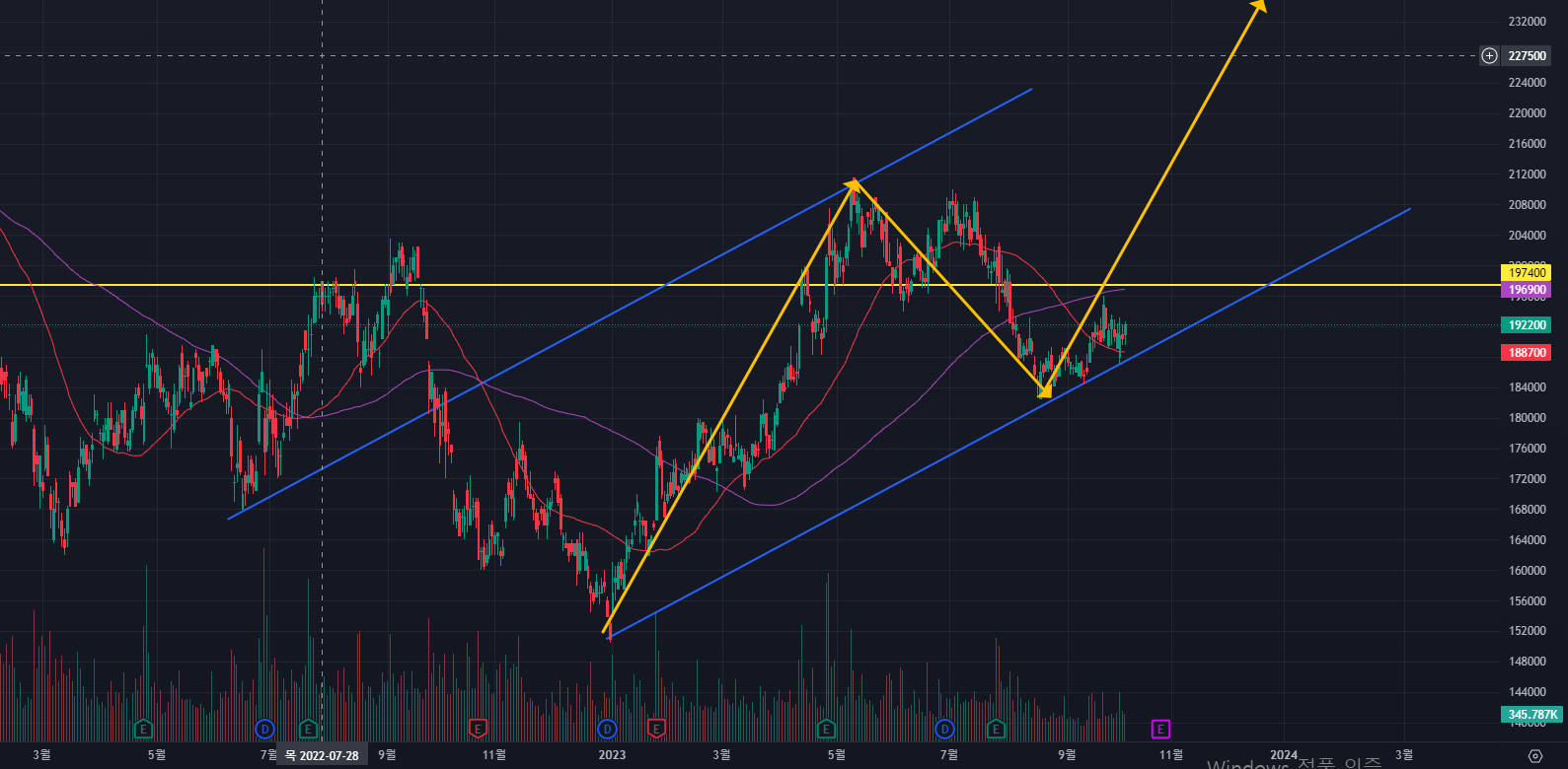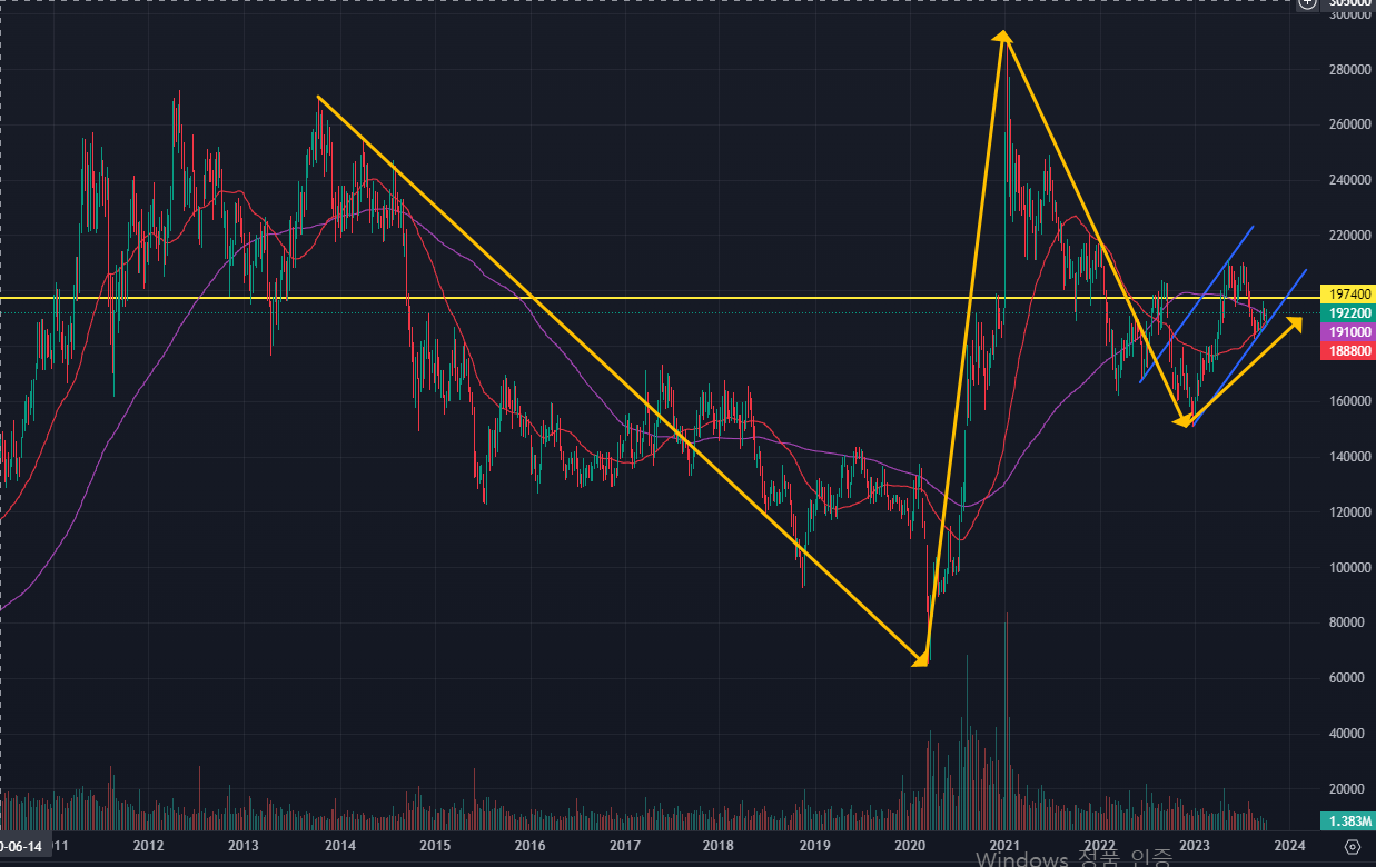현재 주가가 192,200원에 위치해 있는데 다시 197500원 까지 주가가 올라가게되면 거래량과 움직임에 집중해야 한다고 생각합니다.
