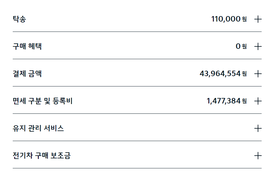 차량가액 43964554원에 취등록세 1477384원이며 여기에 전기차 구매 보조금을 차감해야 합니다.