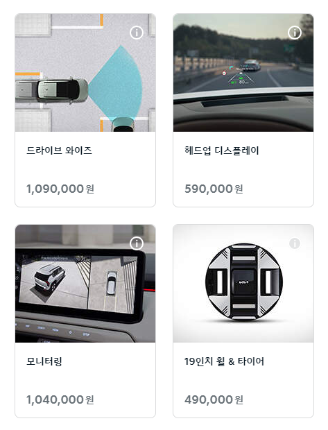 컨비니언스 / 스타일 / 빌트인캠2 / 컴포트 / 드라이브와이즈 / 헤드업디스플레이(HUD) / 모니터링 / 19인치휠&타이어 / 와이드선루프로 구성되어 있습니다.