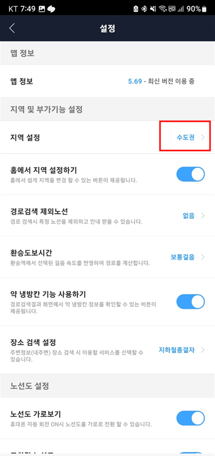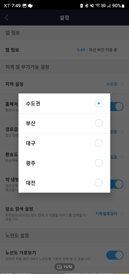 아래처럼 기본 수도권으로 설정된 항목을 다른 지역으로 선택하면 노선도가 해당 지역의 노선도로 변경되니 꼭 기억하시기 바랍니다.