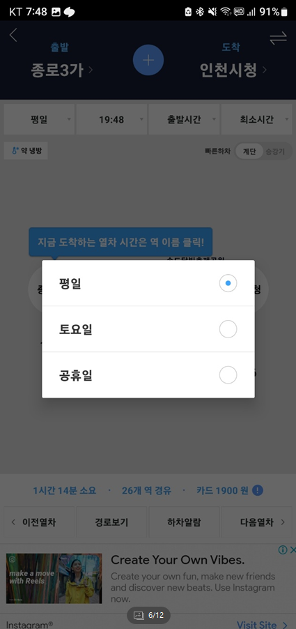 최소환승을 선택하면 환승 수를 가장 작은 노선을 알려줍니다. 하지만 시간은 더 소요될 수도 있습니다.